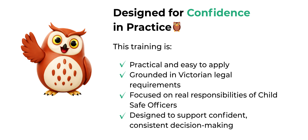 This module is designed to equip Child Safe Officers with the practical knowledge, legal understanding, and confidence to carry out their role effectively within Victorian organisations.